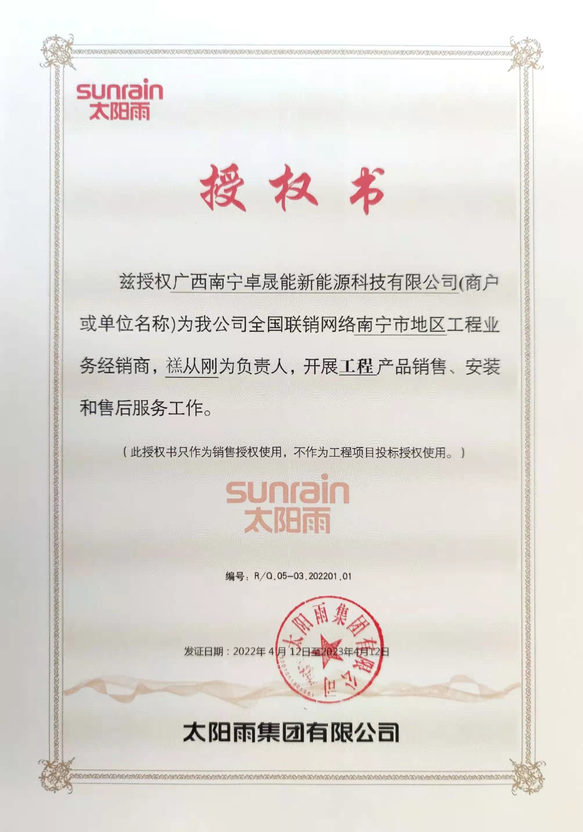 18076542531喜讯喜讯!卓晟能继授权成为纽恩泰一级经销商后,又再次获得太阳雨全国联销网络南宁市地区工程业务经销商!太阳雨再度授权我公司成为经销商说明我公司在市场开拓、风险把控、工程管理、服务满意度等方面有所提升,同时也说明公司在空气能+太阳能等多能源耦合技术上有一定的地位。