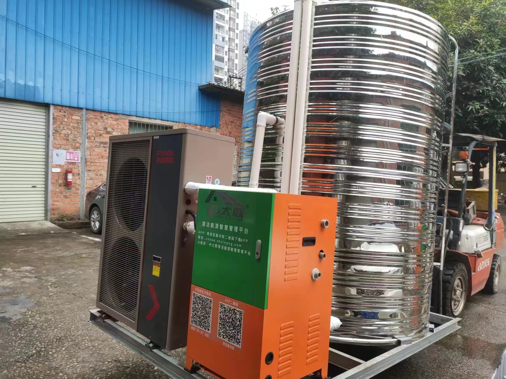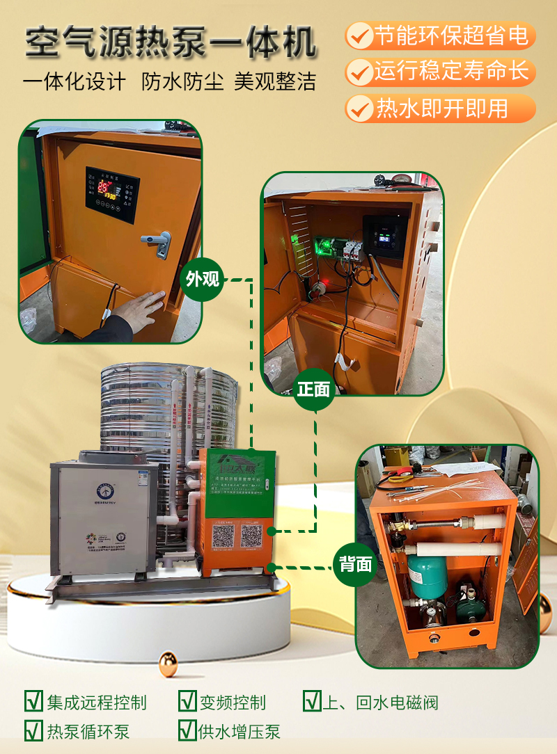 一体机交付,安装方便,国标槽钢底座拉筋设计更稳固。采用压力传感器,0-100%精准液位,智能回水、补水,分仓储存减少水箱间的冷热混合,同时避免因水压不平衡造成的忽冷忽热现象,保证热水即开即用,还可以根据季节的不同灵活调节水温范围,自动调节水温、水位。