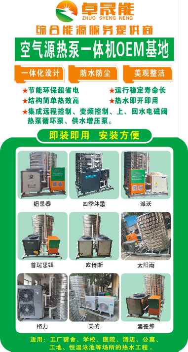 卓晟能作为综合能源服务提供商,为千家万户提供高品质热水工程解决方案,为确保24小时有热水不间断供应,同时要保证合理的水温和稳定的水压。卓晟能联合各大空气源热泵知名品牌推出空气源热泵一体机OEM基地!目前合作的空气源热泵品牌有:美的、格力、纽恩泰、太阳雨、沃派等全国知名品牌及上市企业!