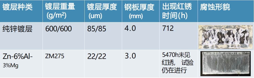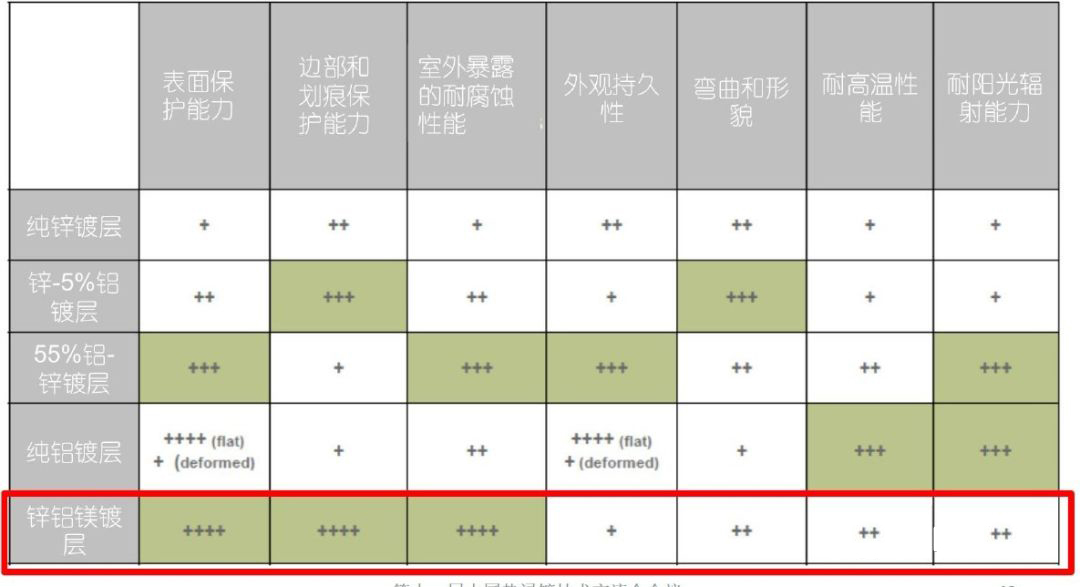 热镀锌铝镁钢板镀层中添加了AL、MG及SI等合金元素,大大提高镀层腐蚀抑制效果,与普通的镀锌产品相比,镀层附着量少却能实现更出色的耐腐蚀性,是热浸镀锌钢板的10~20倍。