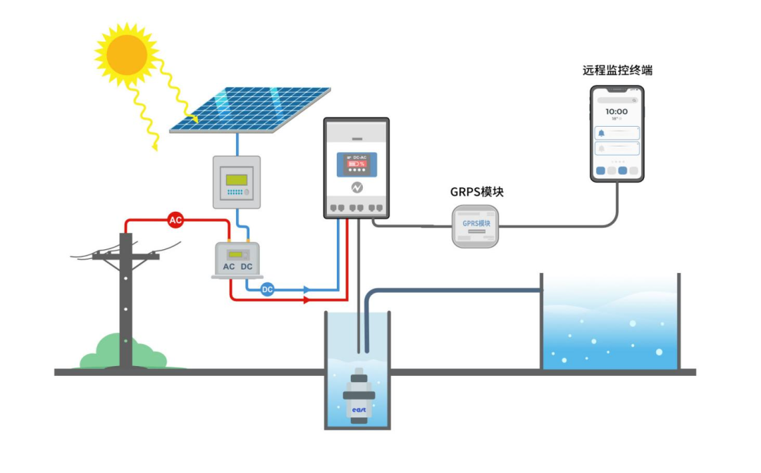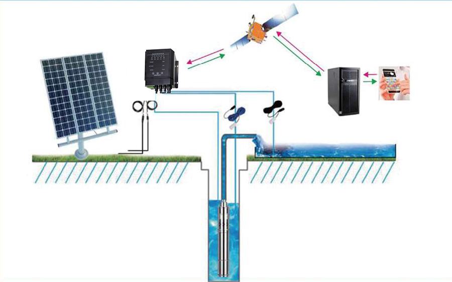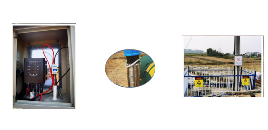 3. 水泵由三相交流电机驱动,从深井中抽水,注入蓄水箱/池,或直接接入灌溉系统。根据实际系统需求和安装条件,采用不同类型的水泵进行工作。