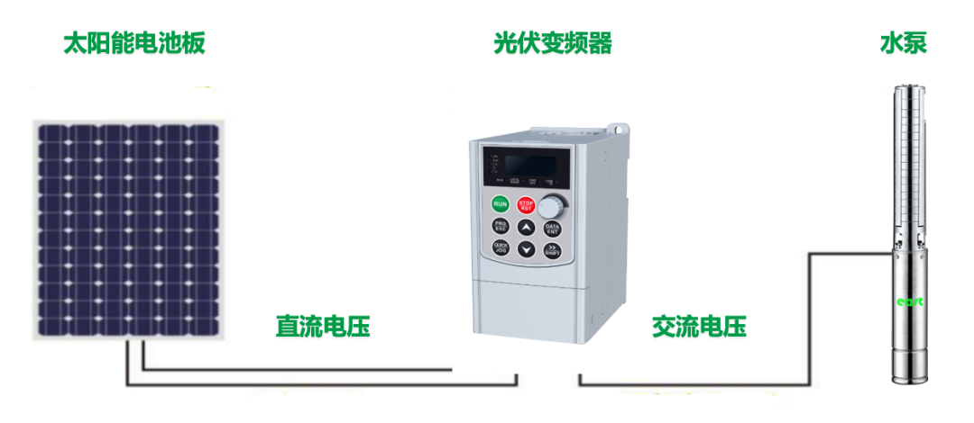 2. 采用光伏扬水逆变器,根据日照强度的变化调节水泵转速,使输出功率接近太阳电池阵列的最大功率;当日照很充足时,保证水泵的转速不超过额定转速;当日照不足时,根据设定最低运行频率是否满足,否则自动停止运行。