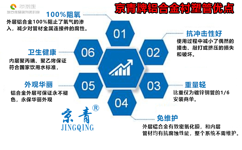 传统的塑料管道在阳光的照射下,容易滋生细菌对水质造成二次污染,影响饮水卫生。而且阳光照射会使管道容易老化而影响管道使用寿命。京青牌铝合金衬塑复合管的内管采用的是无毒、卫生的材质,不存在有毒元素,耐腐蚀、无渗出物、无异味,管内不易结垢,不易滋生细菌,可保持水质纯净卫生。京青牌铝合金衬塑复合管外层是铝合金,内衬是塑料,不仅轻质而且刚性强,内层PPR(或PB)具有健康卫生、耐腐蚀、柔韧性、阻力小等优点;又具有外层铝合金防护层硬度高、刚性好,可以最大程度的降低外界对于管道的伤害。