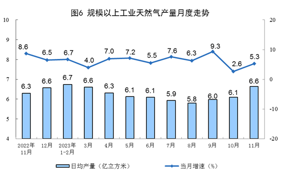 天然气生产增速加快,进口稳定增长。11月份,生产天然气199亿立方米,同比增长5.3%,增速比10月份加快2.7个百分点,日均产量6.6亿立方米。进口天然气1095万吨,同比增长6.1%,增速比10月份回落10.0个百分点。