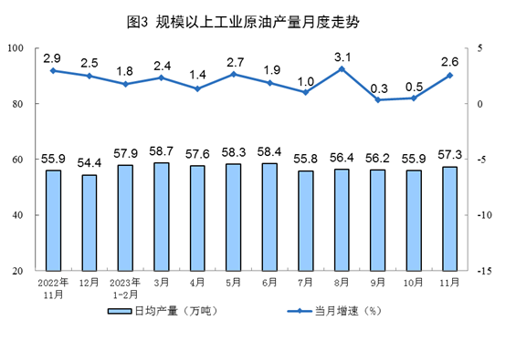 原油生产增速加快,进口增速由增转降。11月份,生产原油1720万吨,同比增长2.6%,增速比10月份加快2.1个百分点,日均产量57.3万吨。进口原油4245万吨,同比下降9.2%,10月份为增长13.6%。