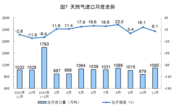1~11月份,生产天然气2096亿立方米,同比增长6.0%。进口天然气10740万吨,同比增长8.5%。