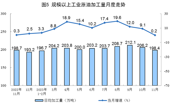 原油加工保持增长。11月份,加工原油5953万吨,同比增长0.2%,增速比10月份回落8.9个百分点,日均加工原油198.4万吨。1~11月份,加工原油67622万吨,同比增长10.1%。