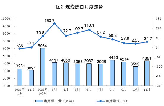 原煤生产有所加快,进口较快增长。11月份,生产原煤4.1亿吨,同比增长4.6%,增速比10月份加快0.8个百分点,日均产量1379.9万吨。进口煤炭4351万吨,同比增长34.7%,增速比10月份加快11.4个百分点。